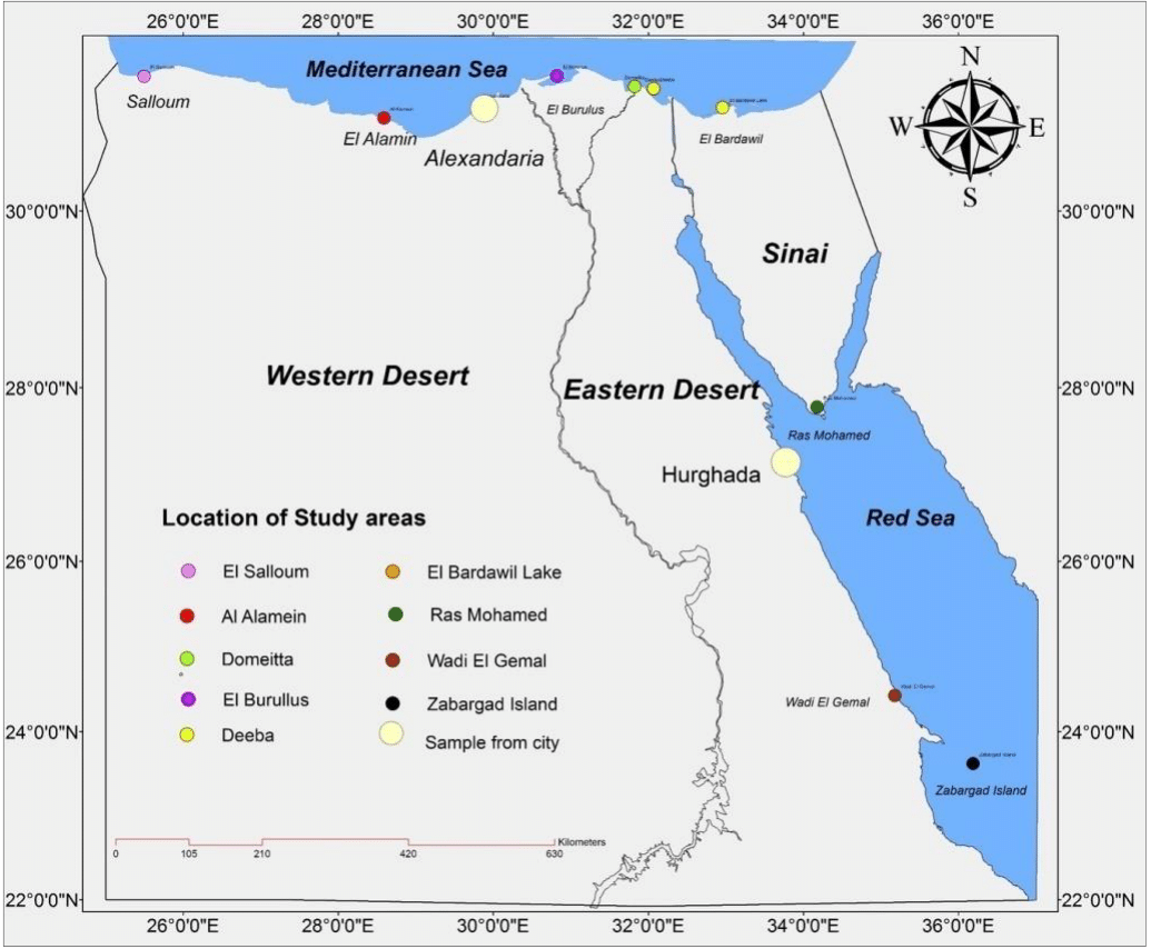 Fieldwork was carried-out from 2016 to 2019 and is divided into two main sections, a) during nesting seasons of Chelonia mydas (green sea turtle) and Caretta caretta (loggerhead sea turtle) from 2016 to 2019 (Figure 1) on both Mediterranean and Red Sea coast in Egypt, b) off nesting seasons survey and stranded individuals. These locations represent most known nesting sites, sites that were predicted to be suitable as nesting, foraging, and wintering areas.