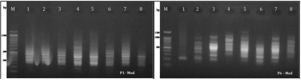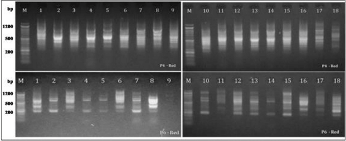In the Red Sea population, the polymorphism percentage for green populations was 69% (50 polymorphic bands out of 72 scorable bands). The highest polymorphic bands detected by primer P4 with 13 polymorphic bands, while P10 recorded as the lowest with 7 polymorphic bands (Table 5, Figure 4).