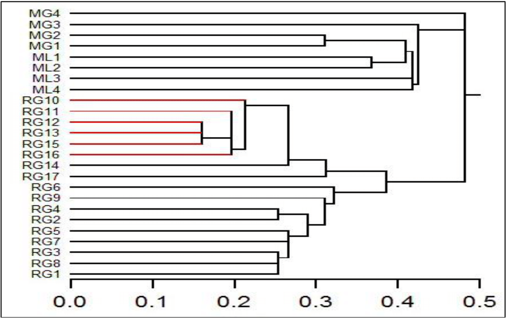 The examined individuals were divided into two major groups at the 0.56 similarity level; one group contained only the Mediterranean populations. The other group was divided into three groups at similarity level 0.38. The Mediterranean green turtle population, MG1, MG2, and MG4 were clustered in one group, as they are from adjacent locations Alexandria and El-Sahel while M3 from Port Said. The same goes for the Mediterranean loggerhead ML1, ML2, and ML4 with some exception for ML3. Also, there were individuals from the Red Sea green turtle population showed a distinguished relationship with each other; where there was close relationship among individuals RG2, RG3, RG4, RG5, RG8, RG9, RG10, RG12 from Zabargad Island, RG13, RG14, RG15, RG16 from Ras Muhammad Protectorate and RG17 from Hurghada. The ISSR clustered the examined populations within two species and separately grouped each population within the given index (Figure 5).