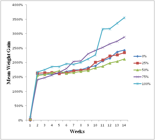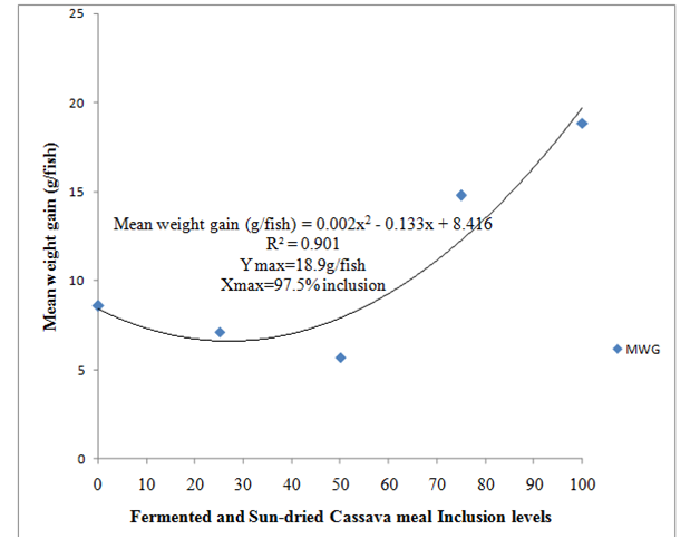 The weekly percentage weight gain expressed on Figure 1 showed continuous growth for all the treatments. Table 3 shows a gradual increase in weight of fish fed the experimental diets. Fish fed 100% cassava leave meal diet inclusion had the highest mean weight gain (MWG) and mean length gain (MLG) with the values 18.83g and 6.6cm respectively and lowest in 50% cassava leave meal diet inclusion with values 5.67g and 3.97cm respectively. Highest specific growth rate (SGR)(2.16%) was recorded in fish fed 75% cassava leave meal diet inclusion and it is not significantly. The Robbin broken-line analysis shows that Mean weight gain(g/fish)=0.002x2-0.133x+8.416; R2=0.901 with Ymax=18.9g/fish and Xmax=97.5% inclusion levels has shown in Figure 2. Table 4 showed highest significant correlation value r2=0.99450, (p<0.05) between the performances of O. niloticus fed 25% and 50% sundried and fermented cassava leaves meal diets. Table 5 shows a significant correlation between Mean weight gain (MWG) Percentage Weight gain (PWG) and Profit Index. The temperature ranged between 24.63 - 28.500C during the experimental period and within the feeding trials. Similarly, Dissolved oxygen was between 6.20 - 8.30 mg/L, pH between 6.90 - 7.80 and ammonia was between 0.17-0.25 mg/L.