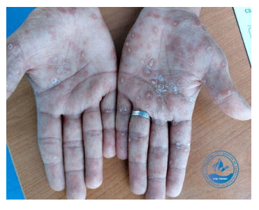 A 35-year-old Moroccan man presented to our outpatient department with numerous bilateral palmoplantar erythematous, scaly, and itchy lesions. The lesions were present for 15 days and showed a rapid extension. He had no history of skin disease or other comorbidities and was not taking any medications or drugs. The patient reported no contact with local irritants and denied unprotected sexual intercourse.