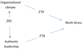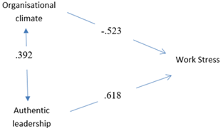 The final stage in analysis was to construct path models from the HMRA output as shown in Figure 2 & 3. Both organizational climate and authentic leadership account for significant portions of the variance in work stress and wellbeing. Because the data is cross sectional it could either be that authentic leadership mediates the impact of organizational climate on the outcome variables, or that organizational climate mediates the impact of authentic leadership the literature would suggest that the former is more likely.
