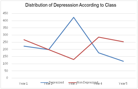 With a response rate of 56.75%, 2270 students participated in the study. Among 2270 students 1235(54.4%) were females and 1035(45.6%) were males. Using the Depression Scale it was found that 1137(50.1%) medical students have depression. Among the students depressed, 666(58.6%) were female students and 471(41.4%) were males. Prevalence of Depression in 1st, 2nd, 3rd, 4th and 5th year MBBS students were found to be 45.5%, 50.1%, 76.5%, 38.1% and 31.6% respectively. Depression was significantly higher in third year students compared to 1st, 2nd and 4thyear (Table 1.1, 1.2, 1.3).
