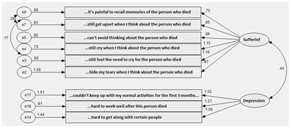 The EFA showed that each part of the instrument contains correlated variables that converge to form factors (constructs/domains) and which together represent a general index of measurement for mourning. Each factor is named after the emotion or state of the ‘I’ that best represented it. The factors ‘Depression’ and ‘Rage I’ were found in Part I of the instrument. In Part II, the factors ‘Pain’, ‘Rage II’ and ‘Miss the deceased’. In Part III, the factors ‘Consciousness of mourning’ and ‘Identification with the deceased’. The factor ‘Pain’ was the major factor in the scale and its most representative items were feelings of emotional pain, sorrow and grief related to the loss. We considered if any of them might be significant in distinguishing between complicated grief from non-complicated grief. The result, from Univariate Logistic Regression was ‘yes’ to the factors ‘Depression’ (Part I) and ‘Pain’ (Part II) as they presented a p-value of 0.033 and 0.003, respectively. To verify the relationship between the factors found, the CFA was performed taking into account the co-variances of all variables in Parts I, II and III among themselves and among the factors. The final adjustment model revealed nine variables highly correlated with each other and were summarized into two major factors called ‘Pain’ and ‘Depression’, reaching Cronbach’s Alpha of 0.828 with CI (95%) = 0.786 to 0.865. However, the instrument has proved to be more reliable (α-Cronbach of 0.885) if seen as a one-dimensional scale, as it is originally described. Futterman et al.,11 in their study of EFA only for Part II of the TRIG, found three factors: ‘Nonacceptance’ identical to ‘Anger’ and ‘Emotional Response’ and ‘Thoughts’ both similar to ‘Pain’ and ‘Miss’, found in this study.