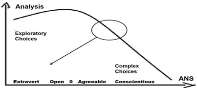A Neuroeconomic model of Decision-Making (NeM) is based on the Triune Conception of Brain and Behavior where the X-axis represents the activation of the Limbic System (Autonomous Nervous System (ANS)) and the Y-axis represents the Frontal cognitive Analysis. This model identifies by neuroeconomic trials a convex functional relationship between ANS and Frontal Analysis identified as risk-willingness.3