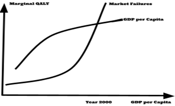 BR is an axiom of GDP per Capita as a simple model of economic growth was in line with Adam Smith that real growth in GDP per capita increases the quality-of-life, was originated 1863.15 Modern research evidences a logarithmic correlation between life-expectancy and growth in GDP: 2% long-term growth in GDP per capita raises life-expectancy by 3 months. Such growth in GDP during 200 years has more than redoubled average life-expectancy in the industrialized world.16 Today, the one-dimensional classical model of market-based growth suffers from serious shortcomings. Since WW2 market-based growth failures have become more and more obvious as illustrated by the exponential rising Market- Failure curve in Figure 3 which refer to an elaborated analysis. The most important research findings on market-failures are: