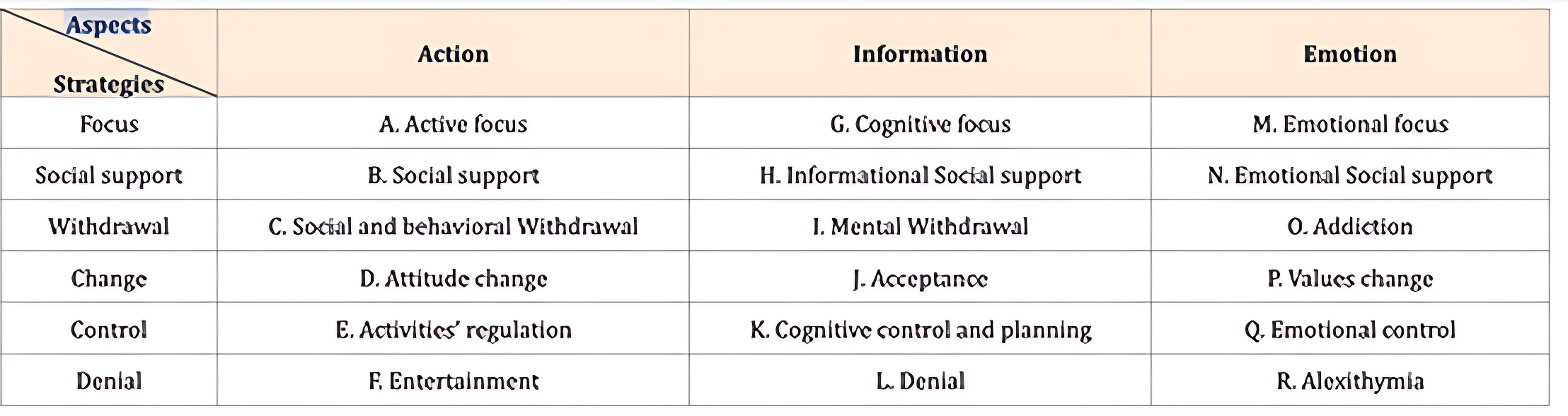 going for a walk. Focus strategies include focusing on the task at hand, such as analyzing breaking the task into smaller, more manageable parts. Social support strategies include seeking support from others, such as talking to a friend or joining a support group. Withdrawal strategies include avoiding the situation, such as stopping or withdrawing from the situation. Attitude change strategies include changing the person's attitude toward the situation, such as looking at the situation from a different perspective or focusing on personal development. Control strategies involve taking control of the situation, such as developing an action plan or setting goals. Finally, denial strategies include the refusal of anxiety’s existence, such as pretending that the problem does not exist.