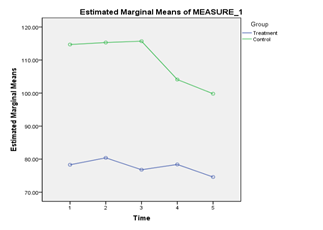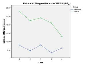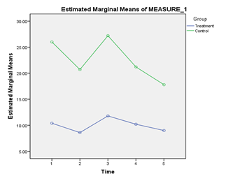 For the AWARE scores, there was no significant main effect of Time, Wilks’ Lambda = .74, F(4,15) = 1.34, p = .30, Partial Eta squared = .26. There was a significant main effect of group, F(1,18) = 9.03, p =.008, Partial Eta squared = .33. Pair wise comparisons indicate that the Intervention Group (M = 77.7, SE = 7.58) had significantly lower AWARE scores than the Control Group (M = 109.92, SE = 7.58); p <.01. No significant interaction was found between group and Time as well, Wilks’ Lambda = .82, F(4,15) = .80, p = .54, Partial Eta squared = .18 (Figure 5).