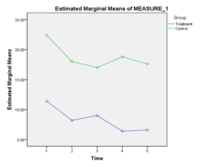 Findings: Measures indicated that there were some differences in scores between the treatment group and control group. For example, during the pre-test there was a difference in scores between the treatment and the control group regarding the dependent variables and except for depression, the scores did not change as a function of time, with depression only changing as a function of time from the second month.
