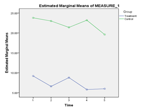 For the SADS scores, no significant interaction was found between Intervention and Time, Wilks’ Lambda = .76, F (4,15) = 1.19, p = .36, Partial Eta squared = .24. There was also no significant main effect of Time, Wilks’ Lambda = .69, F(4,15) = 1.72, p = .20, Partial Eta squared = .31. There was a significant main effect of Intervention, F(1,18) = 8.33, p =.01, Partial Eta squared = .32. Pair wise comparisons indicate that the Intervention Group (M = 8.0, SE = 1.92) had significantly lower SADS scores than the Control Group (M = 15.82, SE = 1.92); p <.05 (Figure 4).