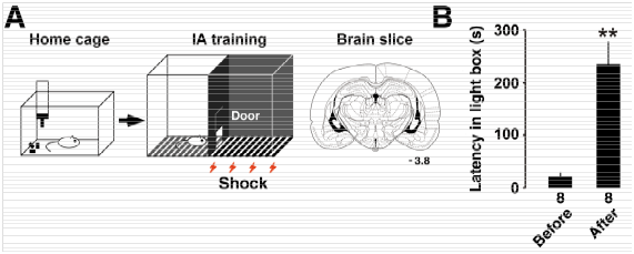 Stressful experience sometimes forms strong episodic memory in the hippocampus, which is useful to avoid similar risk in future. As a learning paradigm, we used an inhibitory avoidance (IA) task. In the task, we placed a rat in an illuminated box. When the rat entered into the dark side of box, we applied brief electrical foot shock in the dark side. Even one-time foot shock experience, the rat quickly learns the experienced episode. The rats were returned to the home cage, then 30 min after, we placed the rat in the illuminated box again. We measured the latency in the illuminated box as a learning performance (Figure 1). After the training, we made acute brain slices to analyze synaptic function using slice patch-clamp technique.