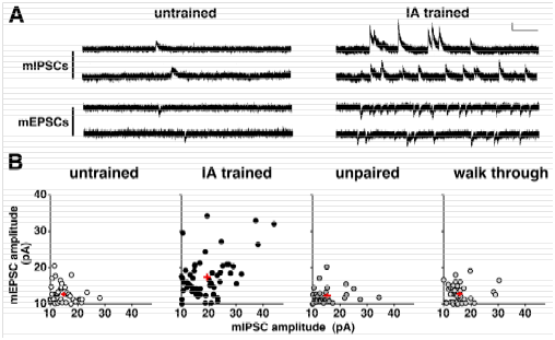 Although some aspect of the training-induced synaptic plasticity6 is similar to the tetanus stimuli-induced LTP,7 we found many novel aspects of plasticity in trained animals. For example, to analyze the plasticity, we recorded the postsynaptic response induced by single vesicle of GABA (mIPSC) or glutamate (mEPSC) in the presence of a Na+ channel blocker (Figure 2A). The means of mEPSC amplitude and mIPSC amplitude were calculated in each neuron, and the data was plotted in Figure 2B. Although the amplitudes were low and showed a narrow distribution range in untrained, unpaired, or walk-through rats, IA training not only strengthened AMPA receptor-mediated excitatory inputs, but also increased GABAA receptor-mediated inhibitory synaptic inputs in CA1 neurons (Figure 2). These results suggest that the training promoted the diversity of excitatory and inhibitory inputs in CA1 neurons. IA training enhanced the diversity of postsynaptic excitatory/inhibitory responses in CA1 neurons. Question arises as to whether the learning requires the synaptic plasticity. We found bilateral CA1 expression of GluA1-c-tail or MPR-DD, an AMPA receptor-delivery blocker, successfully impaired the learning,9 suggesting the contextual learning requires the synaptic delivery of GluA1 containing AMPA receptors. Moreover, recent chromophore-assisted light inactivation technique (CALI) further demonstrated that optical inactivation of synaptic AMPA receptors can erase acquired memory.10 These results further showed that newly delivered GluA1-containing AMPA receptors contribute to forming contextual memory.