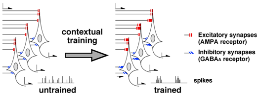 As to the inhibitory synaptic plasticity, nicotinic a7 receptor antagonist is known to block the strengthening of GABAA receptor-mediated synapses.8,11 Since pharmacological blockade of the plasticity in bilateral CA1 impaired the learning, contextual learning seems to require the inhibitory synaptic plasticity in the CA1. Moreover, optogenetic enhancement and suppression technique further revealed the role of the GABAergic inhibitory synapses in learning.12 Taken together, I hypothesized that the contextual learning requires the training-induced synaptic plasticity at both excitatory and inhibitory synapses in CA1 (Figure 3).