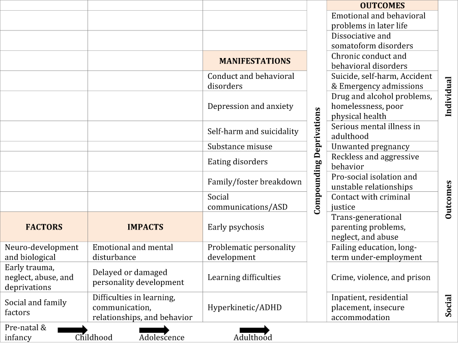 Before birth and at a very young age, predisposing inherited factors exist, which interact with environmental conditions to influence the likelihood that a positive or negative trajectory for the child will be set in motion. With continued negative experiences the child develops internal emotional damage that adversely affects their ability to learn and grow in order to interpret and find meaning in their self and surroundings. They also typically have increasing problems in forming and sustaining healthy attachments. Into adolescence, emotional and developmental difficulties are manifested in a widening range of disturbances and behaviors, which again depend on the presence and interaction of internal and external risk and protective factors. Childhood and adolescent stages are important periods as a lack of effective interventions lead to even more serious and chronic problems into adulthood that usually also affects the person’s own partner, children, family, and community later on. Problems become increasingly difficult to resolve and require escalating levels of resources that are aimed at containing the poor outcomes rather than recovery. Although the developmental model does not propose that someone with deprivation in early life will always mature to mental health and behavioral problems, the probability increases significantly if an effective intervention at the appropriate time does not change the trajectory. Evidence is presented that Mode Deactivation Therapy (MDT) is such an effective intervention for adolescents with behavior problems and other complex, co-existing conditions that achieves sustainable, positive emotional, cognitive, and behavioral changes.
