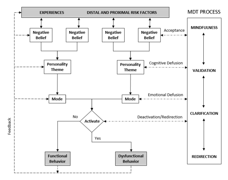The central concepts and techniques of MDT are all designed to facilitate the process of change and lead to the development and implementation of a systematic methodology that is in no way eclectic, but specifically targeted at problematic thinking processes that underlie dysfunctional behavior and distressing inner experiences. In Figure 2, the basic MDT process steps and how they target the dysfunctional cognitive domain are illustrated. Here, it is evident that core beliefs are rooted in cumulative life experiences, influenced by proximal and distal risk factors specific to the individual, and organized in personality-oriented themes or schemas for expedient and instinctive classification of new information and retrieval/activation of familiar response patterns, or modes.