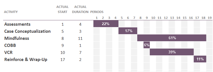 As is evident from the Gantt chart in Figure 3 that illustrates the typical course of an MDT program, stages are generally sequentially completed, with mindfulness exercises that are conducted in parallel from relatively early on until treatment completion. The MDT individual and family assessments, including the client typology survey—essentially a series of clinical and case interviews—are conducted first, followed by the individual or family case conceptualization.