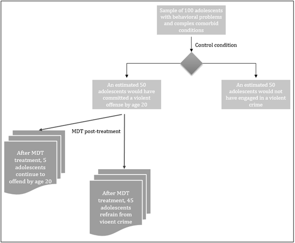 An adapted version of a CONSORT diagram type is used in Figure 4 to illustrate the estimated effects of MDT versus a control condition or no treatment on later violent offending. In this assumed scenario, 45 adolescents out of a 100 that fit the typical profile of youth with serious behavioral problems, would not have offended (or re-offended) as a direct result of receiving MDT treatment. This is used as the basis of the calculation of cost saving attributed to MDT in preventing costs related to a violent offense committed by an adolescent.