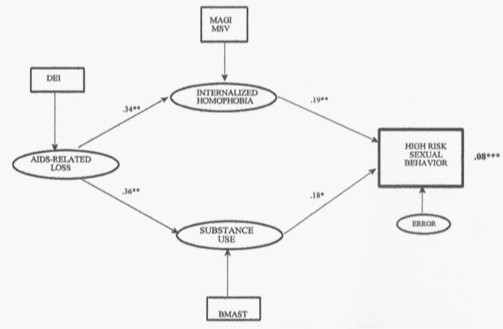 Hypothesis 2: testing a mediational model of high risk sexual behavior: Finally, to determine whether a meditational path emerged from the significant latent variables (AIDS-related loss, internalized homophobia, and substance use) to the dependent variable, high-risk sexual behaviour, two steps were completed. First, AIDS-related loss was regressed on the two latent variables to determine meditational effects; then, the direct effects of internalized homophobia and substance use were examined for significance.