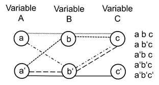 Figure 1 Each line is an elementary relation, each symbolising a single combination of variable values (e.g. abc, ab'c). If all these elementary relations are aggregated by an OR function, we get (A∨ B) → C.