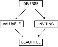 Figure 3 Illustration of the implicative associations of landscape ratings. It is well known in aesthetic literature that diversity triggers feelings of beauty, but not that valuable and inviting can act as mediators in landscapes.
