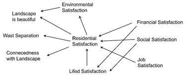 Figure 4 Implicative variable network of satisfaction ratings, landscape ratings and willingness to separate waste. It is understandable that financial, social and working conditions (health was not included) have an influence on housing satisfaction, but it is surprising that housing satisfaction has an influence on environmental satisfaction and attachment to the landscape. Sociodemographic factors (causes) influence attitudes towards landscape and environment (effects) via housing satisfaction (mediator).