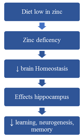 Zinc deficiency and depression Evidence suggested a link between zinc deficiency and depression. Symptoms of depression were observed with zinc serum level of 1.8µM or below as compared to healthy control individuals.18 The dietary zinc intake regulate the zinc homeostasis in brain and the zinc deficiency directly effects hippocampus. Function such as learning, neurogenesis, memory is performed by region of brain hippocampus, so deficiency of zinc affect these functions. Hippocampal neurogenesis and synaptogenesis in adult are regulated by zinc. Recent data suggested that in rodents in DG there is low level of hippocampal vesicular zinc due to zinc deficient diet that results in immature neurons and reduced amount of progenitor cells. Amount of progenitor cells was restored by taking normal zinc containing diet. Neurogenesis can be regulated by zinc by activation of mechanism of p53-dependent molecular that commands cell multiplication and survival of neuronal precursor. The effect of zinc deficiency on learning behavior and memory was also studied. Irreparable effect on learning and memory was produced during the early development as decreased amount of dietary zinc. A study was performed on a young adult rat which was given zinc deficient diet and showed reduced learning behavior but when controlled diet was given the outcomes were recovered. This data suggest that for memory ability and learning appropriate amount of zinc is needed for mature brain (Figure 1).19