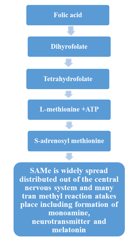 Mechanism of folate in depression: Folate in converted into s-adenosylmethionine. These both are involved in production of neurotransmitters that are involved in depression. Folate deficiency causing depression: 5 methyltetrahydrofolate, active metabolite of folate is involved in re-methylation of homocysteiene, methionine, S-adenosylmethionine participates in various methyl donation reactions. If there is hinderness of 5 MTHF in this process, then it can lead towards depression and other mental disorders (Figure 2).42