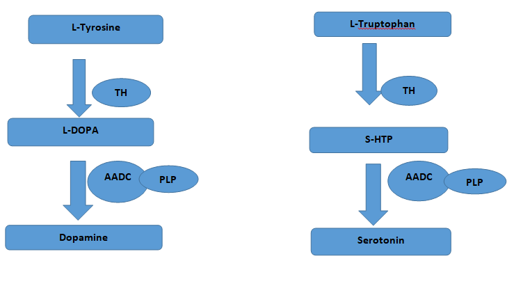 Vitamin B6 is important for the synthesis of neurotransmitters such as dopamine, serotonin and gamma‐aminobutyric acid. Increased pyridoxine in diet in form of supplements or in dietary form has been attributed to have a neuroprotective role. In the figure 4 given below shows that PLP helps in the production of dopamine and serotonin (Figure 4).