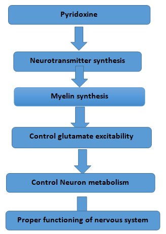 Pyridoxine is linked to treatment of seizures and it is known that deficiency of B6 can lead to impairing the central and the peripheral nervous systems. In summary, it has been found in research the modes of action of pyridoxine are responsible for ensuring the proper functioning and development of the neurological and the nervous system because it facilitates the neurotransmitter synthesis and the synthesis of myelin and is also capable of controlling the glutamate excitability and metabolism in the neurons (Figure 5).57