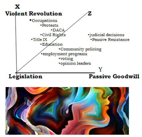 The possibilities of producing change through malleable variables are illustrated in Figure 5. The x-axis proposes change through Violent Revolution whereas the y-axis offers the direct opposite of Passive Goodwill, waiting for change to happen. The middle dimension, axis-z, illustrates the mid-point between violence and passivity through legislation, change mandated by legal means. Scattered along these three dimensions, based on degrees of aggressive change (x), passivity (y), or legal remedy (z), are the malleable variables that change agents can use to intercede and change the system.