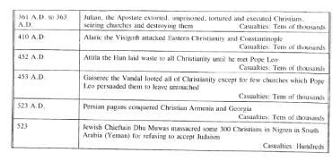 Catholics and other Christians in Asian countries were incredibly faithful and martyr-like in overwhelming numbers. The chapter called "The Chinese Carnage" begins in 1900 with the Boxer Rebellion when the number of bishops, priests, nuns and lay people killed in China duplicated the number killed in Armenia by the Turks at about the same time. That is, scores of bishops, hundreds of priests and nuns and tens of thousands of Catholics brutally murdered. These numbers were to pale in 1948, when ten times that many would be killed by the Chinese communists.