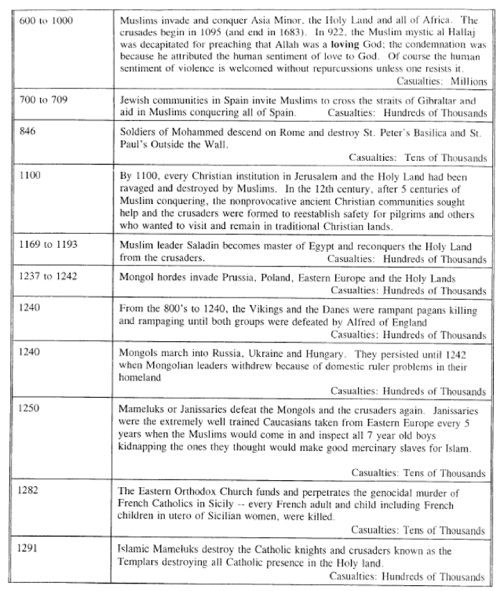 In the last decade of the 20th Century, the Islamic government of the Sudan has murdered over 2 million Catholics and other Christians and probably enslaved as many. Agostino el Nur, a catechist in Sudan was tortured for four months: nails were driven into his head, his beard was pulled out, he was cut with a knife and his genitals were mutilated with pliers and he was crucified for 24 hours, tied to poles, while lighted cigarettes were put in his ears. Muslims openly threaten: "Convert to Islam or die like Christ."