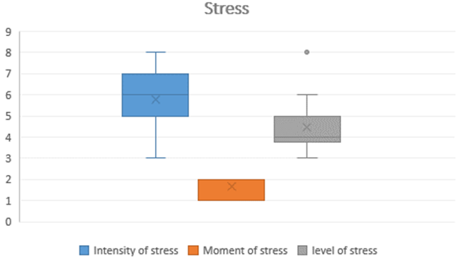 The Intensity and Level of perceived stress is moderate (66.67%, χ²=10.33 and 72.22%, χ²=13 with p<0.001, respectively), the Moment of stress have main significant effect during the competition phase (66.67%, χ²=8, with p<0.05) (Figure 2).