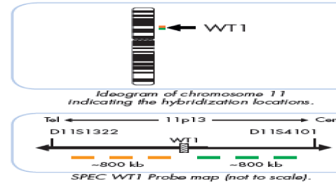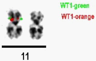 Clinical examination at 2 years of age showed a growth delay with a weight of 12 kg (25th centile), height of 81.5 cm (3rd-10th centile) and an OFC of 47.8 cm (25th centile). He had no particular facial dysmorphic features. However, he presented with developmental delay, could not sit without support, and his speech development was delayed. Informed consent was obtained from the patients parents prior to implementation of a cytogenetic study. According to guidelines in similar cases, high resolution chromosome study at 550 bands level was performed as previously reported and according to the international system for Human Cytogenetics Nomenclature ISCN 2013,6,7 but revealed a normal karyotype (Data not shown). Fluorescence in situ hybridization (FISH) using a probe specific for the WAGR-locus in 11p13 (Zytolight SPEC WT1 Dual Color Break Apart Probe, Zytovision, Bremerhaven) (Figure 1) led to the identification of a typical disease causing microdeletion (Figure 2).