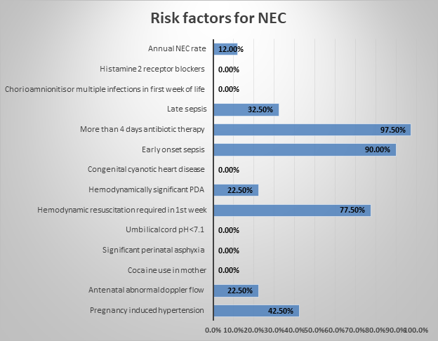 A prospective observational study was conducted, from July 2020 to June 2021,with VLBW newborns admitted to our NICU .Risk factors were assessed using a predefined proforma The various risk factors assessed included growth restriction, birthweight, gestational age, use of glucocorticoid, perinatal asphyxia, 5min APGAR<6,chest compression or epinephrine in delivery room, umbilical cord pH<7.1 from, not kept nil per oral while transfusion, use of antenatal steroids, standardised feeding guideline in unit, use of exclusive human milk feeding, probiotics , cold stress, cocaine use in pregnancy, placental abruption, centre’s annual NEC rate among <1500gms use of histamine receptor lockers, hemodynamic resuscitation in first week of life, hypertensive diseases in mother, type of enteral feeding, congenital cyanotic heart disease in newborn, presence of hemodynamically significant patent ductus arteriosus(HsPDA), indomethacin or surgical treatment for PDA,