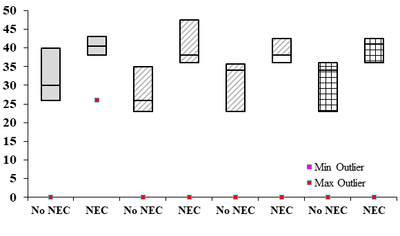 The median (IQR) GUTCHECK scoring at 72 hrs., 86 hrs., 7 days, 14days, 21days and 28 days were 34 (31, 38), 34 (30, 39), 34 (26, 43), 31 (23, 35), 35 (23, 38), 35 (30, 40). The median risk for developing NEC was high (33-36) on all days except day 14, when it was moderate (20-32) (Figure 4).NEC was diagnosed in 9/52 (17.3%) NBs admitted during the study period. Surgical NEC was detected in 2(22%) and the rest were medical NEC. The median age of development of NEC was 5 days (range (IQR) - 2-18 (4, 12) days). Of the NB who developed NEC, 3 expired, 1 left against medical advice and the rest survived to discharge.