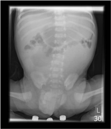 A term male infant conceived via In vitro fertilisation, presented with bile-stained vomiting 2 days after discharge from the maternity unit. Observations on admission were within normal parameters, and the abdomen was non-distended. An abdominal film revealed duodenal and proximal jejunal distension, with paucity of small bowel gas distally (Figure 1). The patient was taken to theatre with a tentative diagnosis of jejunal stenosis.