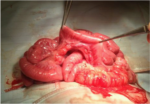 Internal hernias are recognized as a rare feature of some forms of malrotation. Left and right paraduodenal hernias are the most common recognized internal hernias, with left being more common than right.4 A right paraduodenal hernia results from incomplete rotation resulting in the small bowel becoming caught in the mesentery of the ascending colon. When the ascending colon becomes fixed to the retroperitoneum, the small bowel loops become trapped behind the mesentery. A left paraduodenal hernia is thought to result from reversed rotation, resulting in the small bowel becoming trapped by the mesentery of the descending colon upon its retroperitoneal fixation.5 The findings at laparotomy in this case are clearly different to the paraduodenal hernias described in the literature. As demonstrated in Figure 2, rather than large bowel mesentery, it is at the level of the small bowel mesentery where jejunal obstruction occurs.