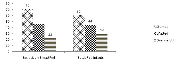 The study assessed that the overall nutritional status of bottle-fed infants was far much better than exclusively breast-fed infants. One possible reason could be that mostly mothers were educated and belong to middle income families and because they had proper knowledge of bottle feeding practices, their infants had good nutritional status. It was seen that socio-demographic characteristics of mothers have significant influence on feeding practices.