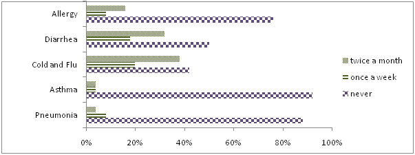 Majority of the bottle-fed infants never suffered from pneumonia and asthma. However 38% of bottle-fed infants suffered from cold and flu twice a month, 32% bottle-fed infants suffered from diarrhea twice a month .Also 16% bottle-fed infants suffered from allergy twice a month (Figure 3).