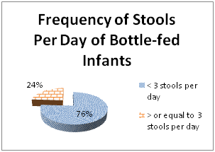 72% of the bottle-fed infants passed < 3 stools per day and 28% infants passed equal to or greater than 3 stools per day (Figure 5).