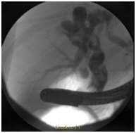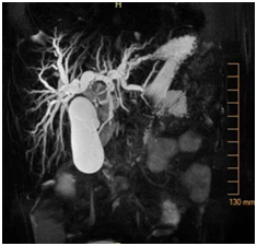 Figure 1 Magnetic resonance cholangiopancreatography (MRCP) showing diffuse dilation of the intrahepatic, common hepatic, and common bile ducts; distended gallbladder. T2 hypodense lesion in common bile duct extending into common hepatic duct, consistent with biliary sludge.