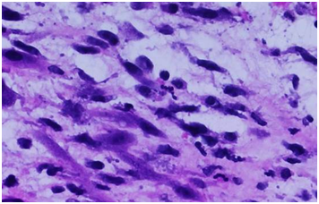An 11-year-old girl with history of sickle cell trait and allergic rhinitis presented to the emergency department for pruritus. She had been evaluated at an urgent care clinic three weeks prior for generalized rash and pruritus, and was diagnosed with contact dermatitis. At current presentation, rash had resolved but she had persistent pruritus. No abdominal pain. She had scleral icterus, but family reported this was not uncommon as it occurred for over a year and seemed to get worse with her “seasonal allergies”. Initial assessment showed a thin nontoxic appearing girl with normal vital signs and an exam significant for icteric sclerae, excoriations but no rash, and a nontender abdomen with liver palpable 2cm below the right costal margin. Laboratory results showed elevations in direct bilirubin, alkaline phosphatase, and GGT. Ultrasound showed intrahepatic biliary dilation with an echogenic area in the common hepatic duct suggestive of sludge. She had a magnetic resonance cholangiopancreatography (MRCP) that showed diffuse dilation of the intrahepatic, common hepatic, and common bile ducts; a distended gallbladder; and a T2 hypodense lesion in common bile duct extending into common hepatic duct that was consistent with biliary sludge (Figure 1), with suspicion for choledochal cyst. She then had an upper endoscopy, which was significant for a lesion protruding from the ampulla that had the appearance of a blood clot. It was extracted after sphincterotomy, and noted to have a thin stalk-like attachment, measuring 1.3cm in length, which was partially resected and sent to pathology (Figure 2&3). Pathology was significant for a polypoid tumor with variable cellularity, and “tadpole” shaped cells having cytoplasmic cross striations, and a high proliferative index by Ki67 stain. These findings were diagnostic of a botryoid variant of embryonal rhabdomyosarcoma. She was started on chemotherapy with vincristine, adriamycin, and cyclophosphamide (VAC), and improved with this regimen. She has not required surgery or radiation (Figure 4A-4C).
