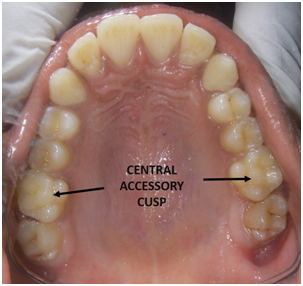 Dens evaginatus is a variance of odontogenesis, which is characterized by enamel covered conical tubercle that may enclose dentin and pulpal tissue. Central cusps (occlusal supernumerary cusps) are located between the buccal and the lingual cusp tips in the occlusal surface of the premolars and molars and on the lingual surface of the incisors and canines. Pedersen1 described central tubercle as “a peculiar enamel pearl-like ‘cusp’ on the occlusal surface” of the right upper molar in an Eskimo from Greenland. The most commonly reported accessory cusps are cusp of carabelli of the molars, talons cusps of the incisors and leong’s tubercle of premolar. These variations can be seen both in primary and in permanent dentitions.2 Even though, Dens evaginatus or accessory central cusp was described commonly in premolars, they were infrequent in molars. In primary dentition, they were confined to maxillary second molars, either unilaterally or bilaterally.3 In permanent molars, they were reported unilaterally in mandibular third molar and maxillary second molar.4 Within the bounds of our literature search, no central accessory cusp has been reported in permanent maxillary first molars.