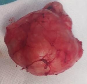 The management strategy for giant cervical teratomas differs: most authors opt for a cesarean section from the outset regardless of the size of the tumor from 36 weeks.12 The intervention is scheduled as a delayed emergency after stabilization and conditioning of the newborn. Ex utero intrapartum treatment (EXIT) represents an alternative.13,14 As soon as the uterine cavity is opened, nasotracheal intubation or tracheotomy is carried out depending on the size of the mass and its impact on the airways. Clamping of the cord only takes place if a free airway has been ensured. Surgical treatment of these tumors must be early because of the risks of respiratory distress and degeneration.11 The pathological examination is the only examination which allows the diagnosis of teratoma to be made with certainty. The assessment will be completed by the alpha-fetoprotein dosage, which will be repeated after tumor excision.8,15 When tumor markers such as alpha-fetoprotein and bHCG (b human chorionic gonadotropin) are abnormal, this affirms the presence of a malignant secreting component in the teratoma even if it is not found by the pathologist.16 The non-existence of antenatal diagnosis and the late recourse to care in our work context requires emergency treatment.of the case upon consultation. The pathological examination carried out on the surgical specimen concluded that it was a mature teratoma without signs of malignancy corroborated by the alpha-fetoprotein dosage who is negative income in both cases.