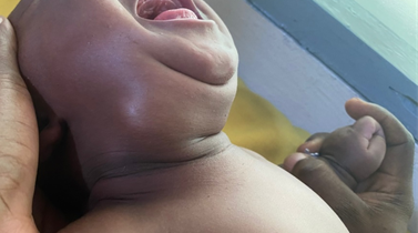 Two-week-old female newborn seen in consultation for congenital right side-cervical mass. The examination reveals an unremarkable gestational history with good monitoring of the pregnancy and a full-term vaginal delivery. We find a hard, multilobulated right side-cervical swelling that is mobile in relation to the deep and superficial planes without satellite lymphadenopathy (Figure 6). An ultrasound is performed of the mass which reveals a hyper-vascularized right side-cervical lymph node cluster in a well-defined agglomerate measuring approximately 21.4 x 22.9 millimeters. Blood alpha-fetoprotein was very high at 9684.80 ng/ml (normal < 15 ng/ml). We concluded that it was a laterocervical teratoma and the infant was taken to the operating room for one-piece surgical excision of the tumor. Pathological examination of the surgical specimen concluded it was a mature multi-tissue teratoma. The postoperative course was simple with normalization of alpha-fetoprotein at 9 months postoperatively.