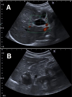 A: Ultrasound scans showing a Cystic formation in the hepatic hilum.
