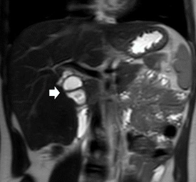 Figure 2 Coronal MRCP T2 image shows a cystic ductal formation in the hepatic hilum (arrow) suggestive of a choledochal cyst.