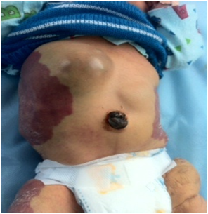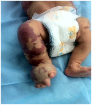 The index case, baby of ‘X’ aged day 01, a term male neonate of non-consanguineous parents, hailing from Rafiabad Baramullah, was admitted on April 25, 2015 in Post Graduate Department of Pediatrics GMC Srinagar with swelling of both the lower limbs, multiple macular, sharply circumscribed, pink colored, varied in size, vascular malformations, tortuous venous swelling in the medial aspect of right leg and a soft irregular movable swelling in the right thoraco-abdominal region. The mother was 35 years of age; para 05, gravida 05. She was on regular antenatal checkup and the baby was born at term by normal vaginal delivery. On examination, the neonate had 4300 gm weight on admission, length 51 cm, OFC 35 cm; multiple port-wine stains were found predominantly on the lower limbs and the trunk, associated with non-pitting hypertrophied lower limbs and tortuous bluish colored varicose venous channels in medial aspect of right leg and near right axilla (Figure 1). There was a soft ill-defined movable swelling about 7×5 size cm, not fixed with under lying structures or overlying smooth normal skin in thoracoabdominal area (Figure 2). There was no cardiac murmur and no bruit in other areas (e.g. gut, vascular channels), ophthalmologic examination was normal. On investigation, complete blood count including the thrombocyte count was normal, x ray babygram was also normal, ultrasonography of abdomen showed large cystic lesions in right upper quadrant of abdomen and around kidneys (R>l) and in retroperitoneum and that of head was normal and C-reactive protein was normal. Coagulogram was normal and echocardiography done did not show any cardiac malformation. The neonate was clinically diagnosed as a case of Klippel-Trenaunay-Weber syndrome. Verbal consent from parents was taken to report the case as a scientific paper.