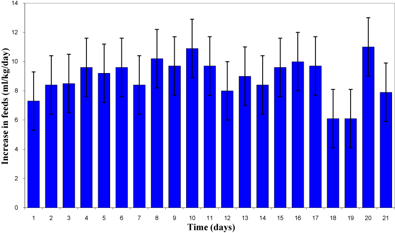 Figure 1 Increases in daily feeds (ml/kg) in study cohort during the first 21 days of enteral feeding (n=103 infants given as (mean±SEM).